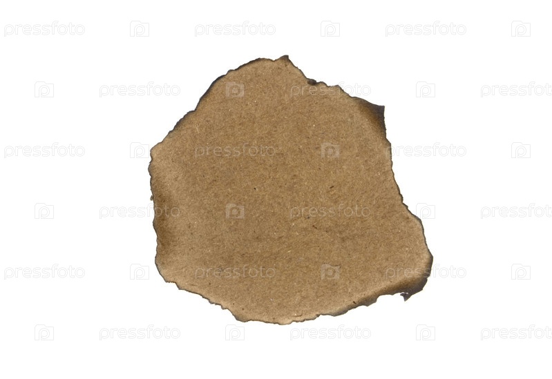 Сгоревший коричневый лист картона, изолированные на белом фоне. Прожженная дыра в белом листе. Старинная обугленная бумага. Баннер. Копировать пространство