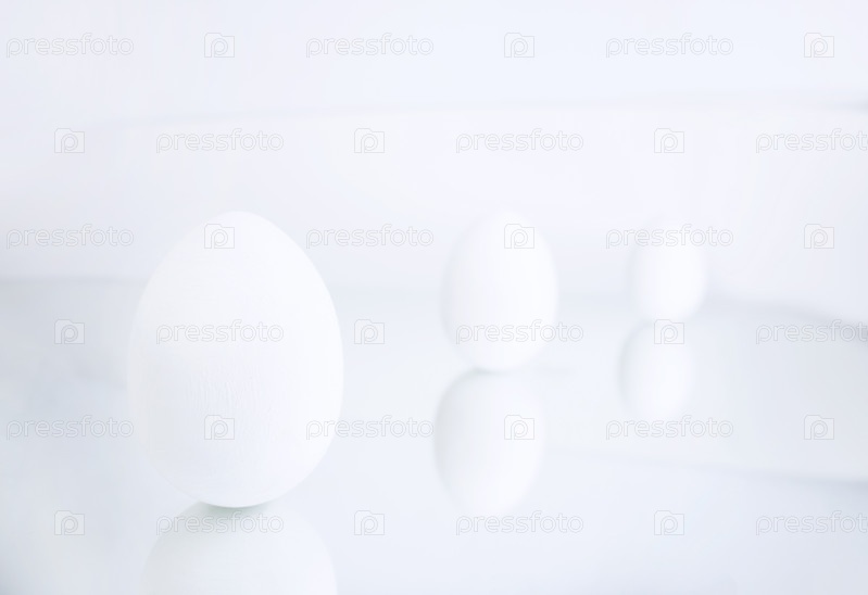 Куриные яйца, окрашенные в белый цвет на сером фоне, отражаются на зеркальной поверхности. Креативная открытка с Пасхой. Копировать пространство