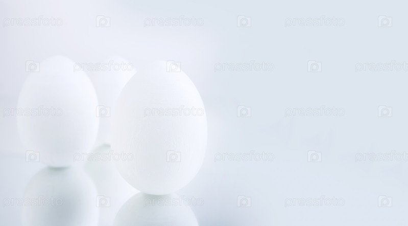 Куриные яйца, окрашенные в белый цвет на сером фоне, отражаются на зеркальной поверхности. Креативная открытка с Пасхой. Копировать пространство