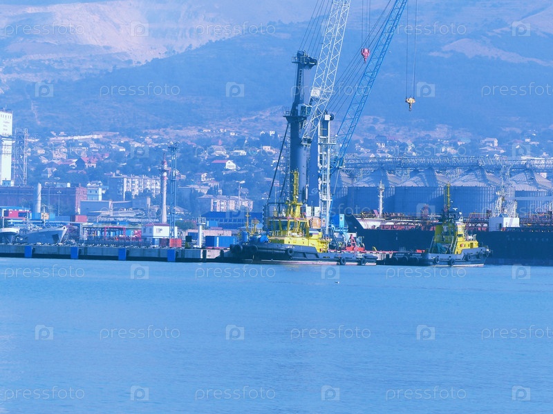 Утро в порту. Буксиры перевозят плавучий кран. Южный порт