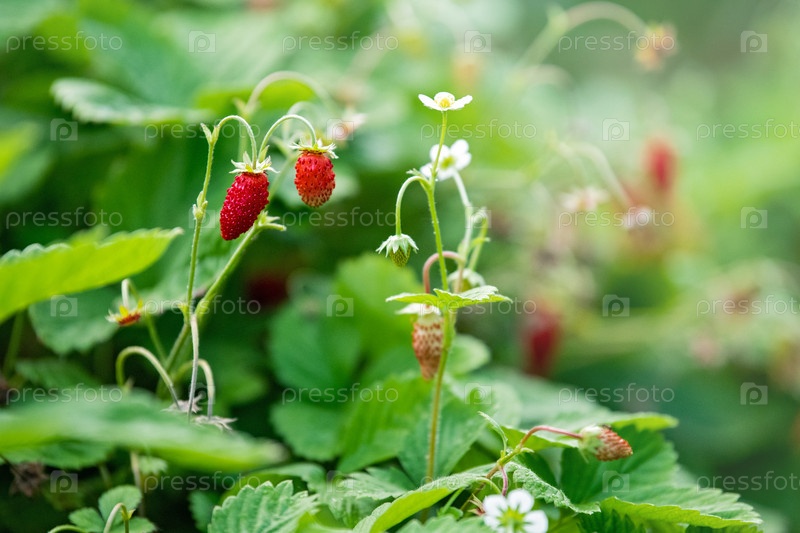 Лесная клубника растет на кровати, боке от мелких брызг воды, баннер