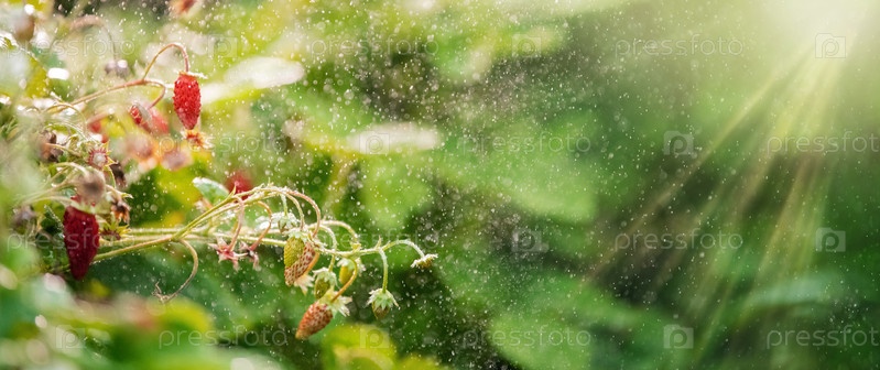Лесная клубника растет на кровати, боке от мелких брызг воды, баннер