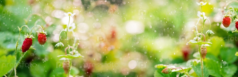 Лесная клубника растет на кровати, боке от мелких брызг воды, баннер