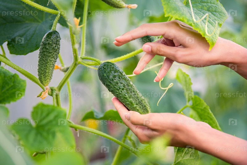 Изящные руки держат зеленый огурец, который растет на ветке в теплице. Сбор урожая в огороде летом