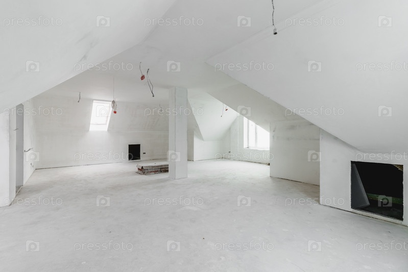 Просторные пустые комнаты мансардного этажа после выполнения работ на стене и потолке