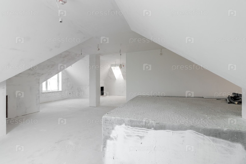 Просторные пустые комнаты мансардного этажа после выполнения работ на стене и потолке