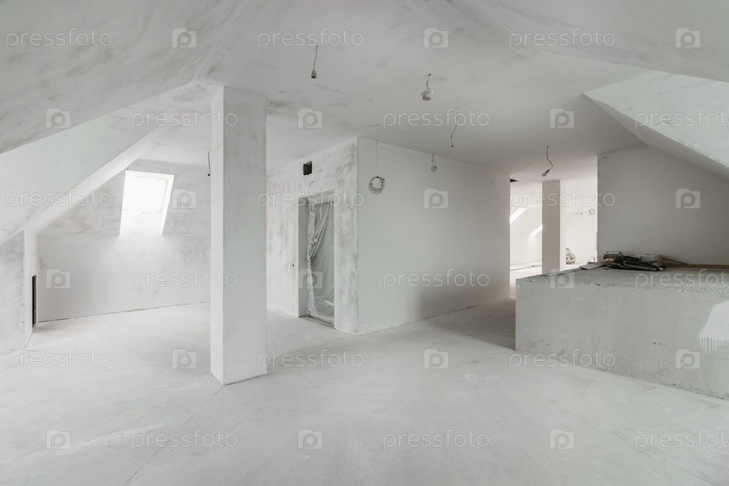 Просторные пустые комнаты мансардного этажа после выполнения работ на стене и потолке