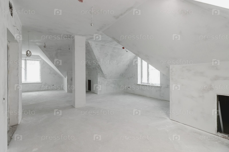 Просторные пустые комнаты мансардного этажа после выполнения работ на стене и потолке