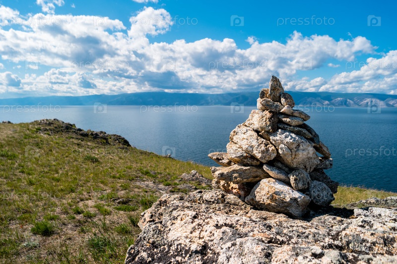 Туристическая пирамида из камней на фоне озера Байкал. Остров Ольхон, Россия