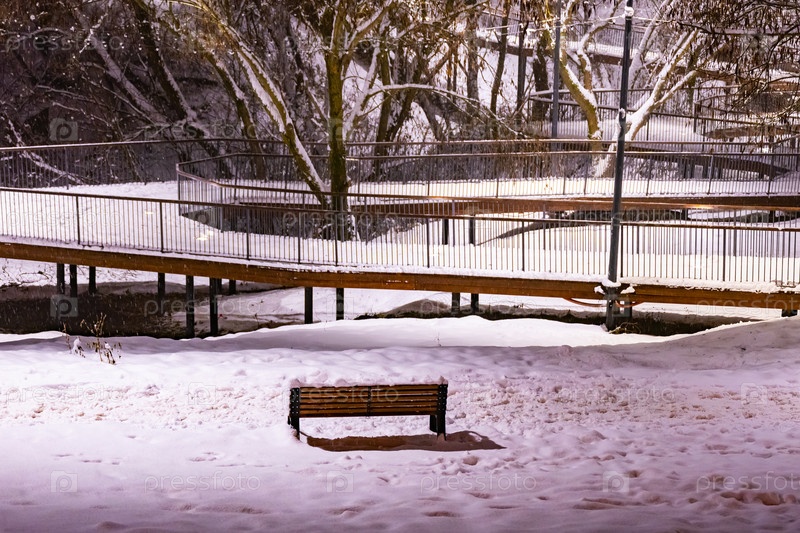 Зимний парк вечером, покрытый снегом, с рядом фонарей