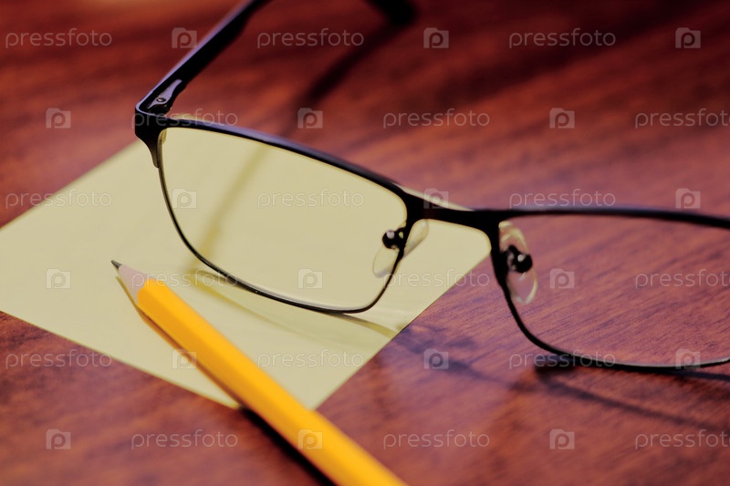Очки, стикер, карандаш, на столе, темный фон, крупный план