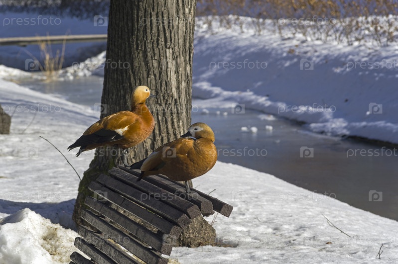 Две утки-огаря на скамейке в зимнем парке. Солнечный день в начале марта. Аптекарский Огород (филиал ботанического сада МГУ). Москва