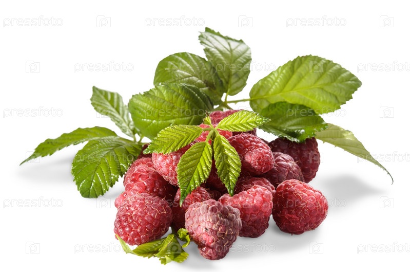 Спелая малина с листьями на белом фоне с мягкой тенью