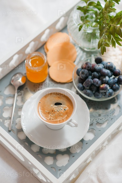 Чашечка кофе на подносе. Завтрак в постель
