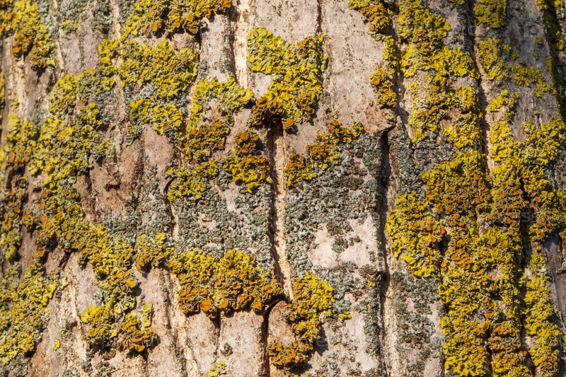 Текстура коры дерева с зеленым лишайником крупным планом на естественном фоне