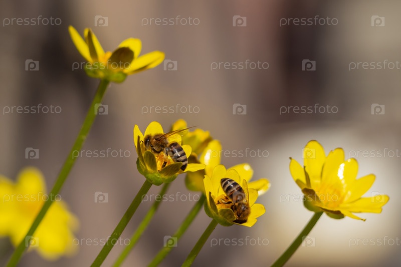 Пчелы собирают пыльцу на маленьких желтых цветках крупным планом. Медоносные пчелы опыляют весенние цветы первоцветы крупным планом