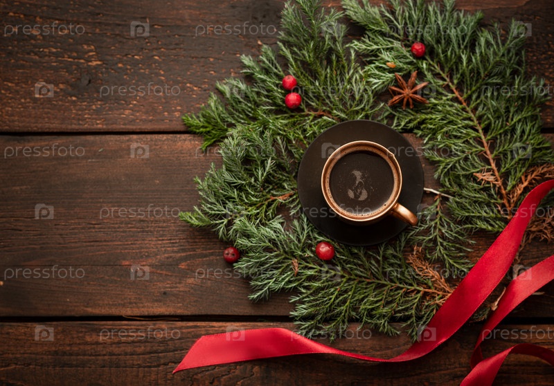 Золотая чашка кофе среди веток хвои. Новогодний декор