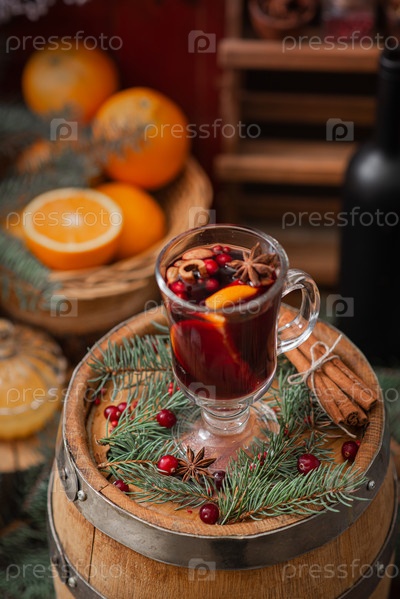 Глинтвейн в стеклянном стакане. Зимний декор