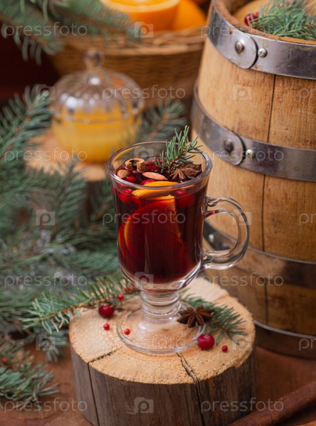 Глинтвейн в стеклянном стакане. Зимний декор