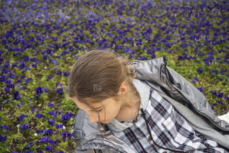 Девочка-подросток на лужайке с фиолетовыми цветами в парке. Девушка и весенний цветок. Открытый романтический портрет молодой счастливой и привлекательной девушки в клетчатой толстовке с капюшоном, наслаждающейся беззаботным времяпрепровождением