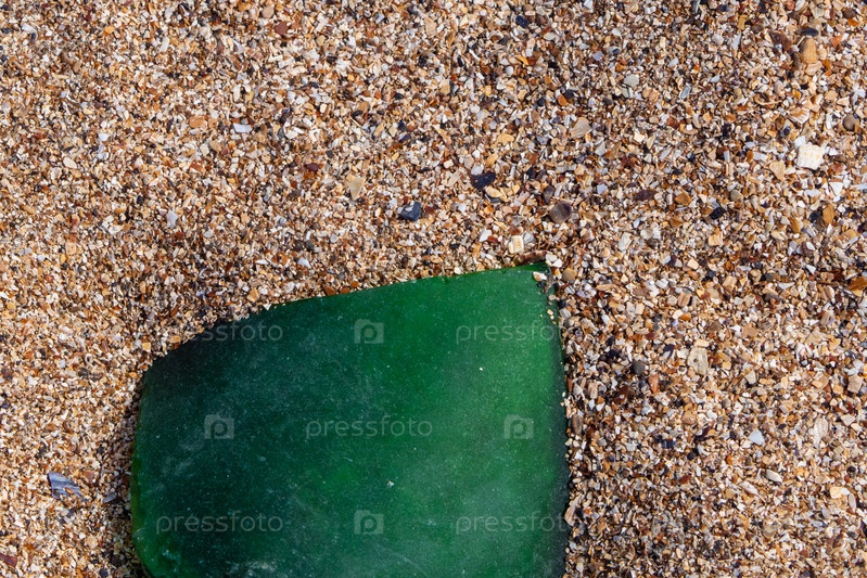 Кусок стекла на песке. Осколок зеленого матового стекла из бутылки на пляже из ракушек. Кусочек стекла, отполированный морем на песке. Кусок зеленого стекла, лежащий на берегу моря
