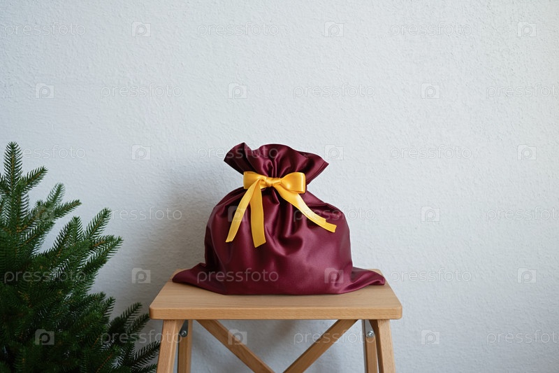 Подарочный пакет стоит на стремянке у елки