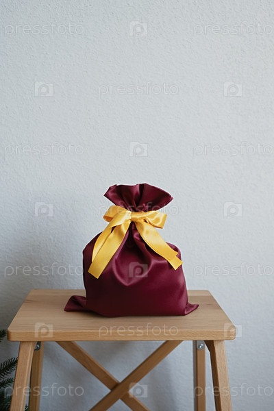 Подарочный пакет стоит на стремянке у елки