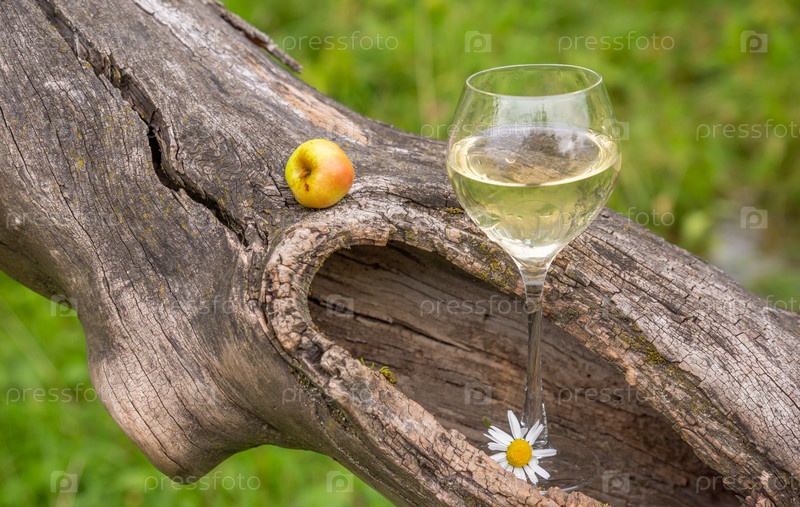 Бокал вина в старой сухой яблони
