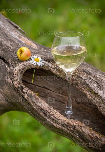 Бокал вина в старой сухой яблони