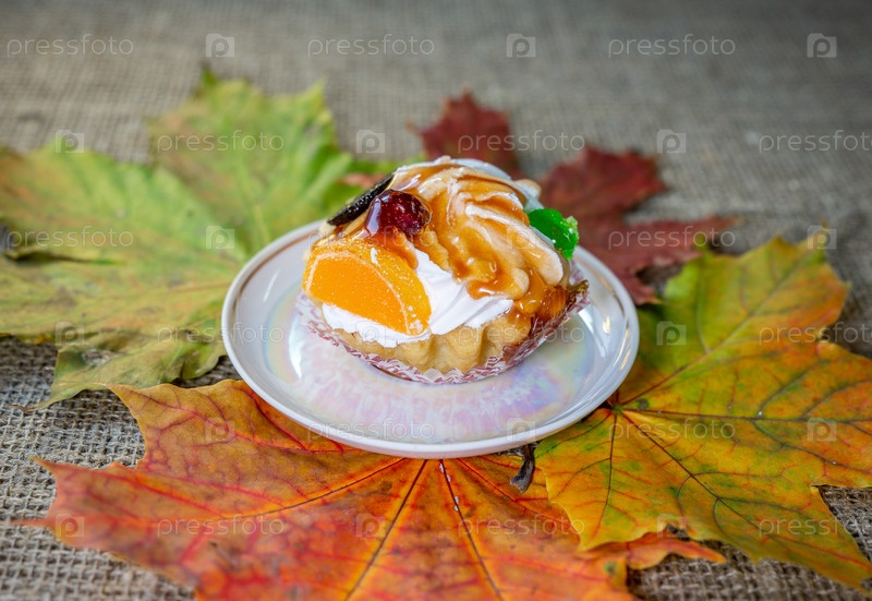 Сладкий десерт на кленовых листьях, на фоне мешковины