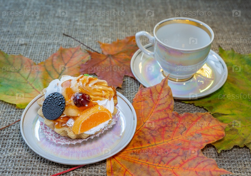 Сладкий десерт на кленовых листьях, на фоне мешковины