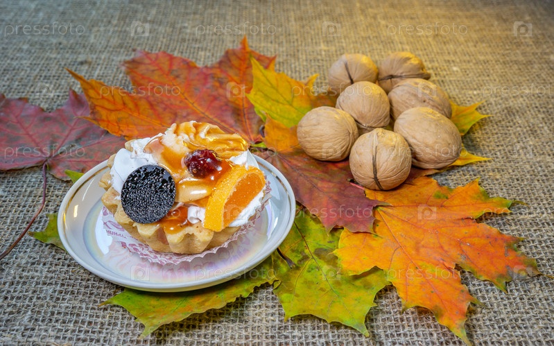 Сладкий десерт на кленовых листьях, на фоне мешковины