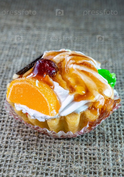 Сладкий десерт на фоне мешковины