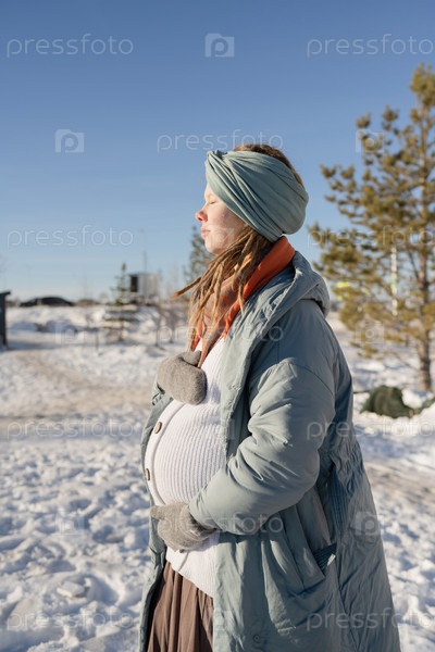 Расслабленная беременная молодая женщина с закрытыми глазами, обнимающая живот в парке зимой, в теплом пуховике