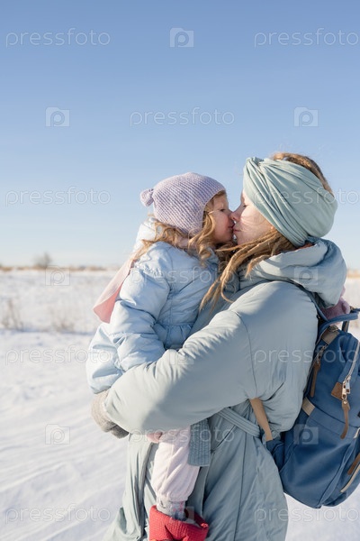 Портрет матери и дочери, обнимающихся зимой на природе