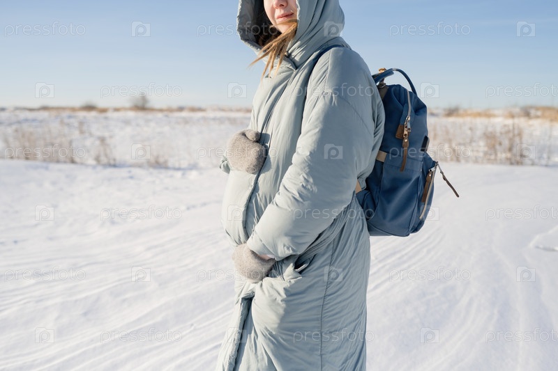 Беременная молодая женщина с рюкзаком обнимает живот теплыми варежками, стоя зимой на природе