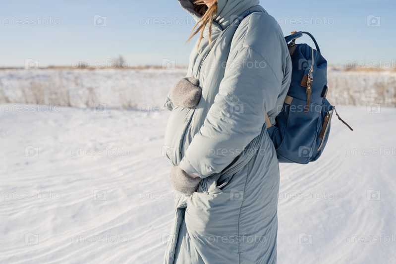 Беременная молодая женщина с рюкзаком обнимает живот теплыми варежками, стоя зимой на природе