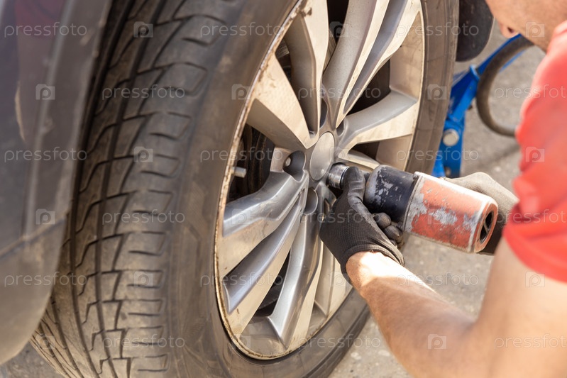 Сезонные шины Замена автомобильной фото темы. Работник по продаже шин завершает замену автомобильных колес. Фото крупным планом