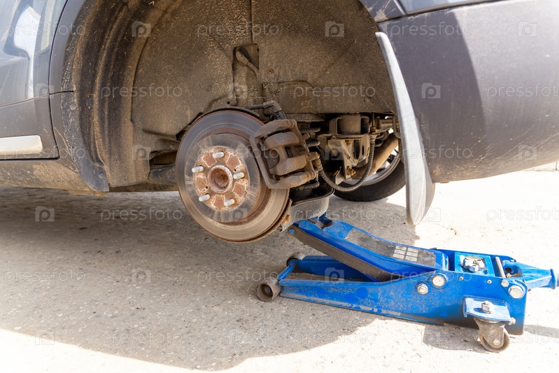 Гидравлический автомобильный домкрат поднимает новый автомобиль для замены шины