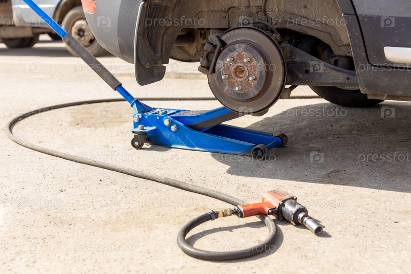 Гидравлический автомобильный домкрат поднимает новый автомобиль для замены шины. Сезонная смена шин или сервисное абстрактное понятие