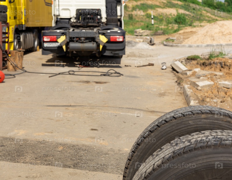 Грузовик во время ожидания ремонта колеса в гараже на открытом воздухе с солнечным светом