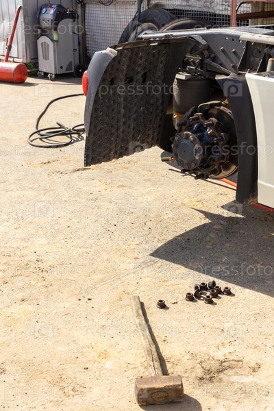 Грузовик во время ожидания ремонта колеса в гараже на открытом воздухе с солнечным светом