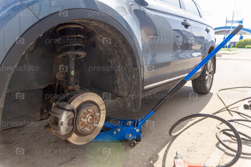 Гидравлический автомобильный домкрат поднимает новый автомобиль для замены шины. Сезонная смена шин или сервисное абстрактное понятие
