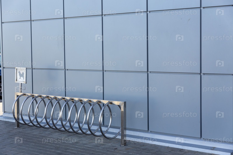 Пустая парковка для велосипедов перед магазином. Парковка велосипедов в общественном месте. Пустая парковка для велосипедов на улице
