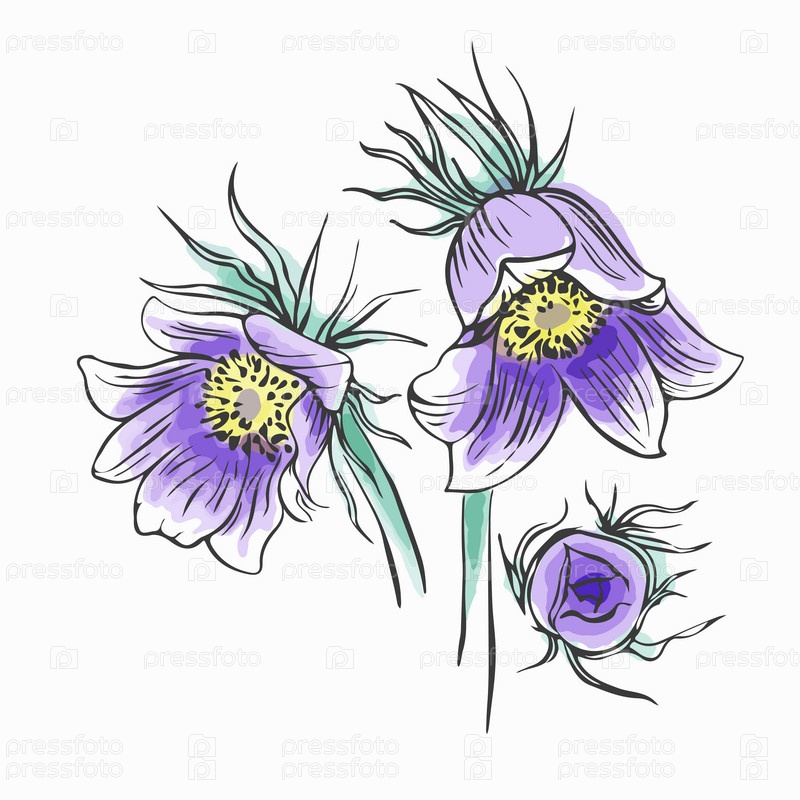 Коллекция рисованной. Люмбаго-луг, набор эскизов цветочных чернил Pulsatilla, цветок Vector Pasque, выделенный в белом цвете. Цветовая иллюстрация, Многолетнее ядовитое цветущее растение для фитотерапии медицины