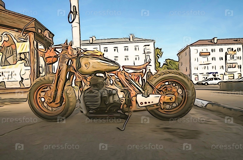 Большой старинный мотоцикл в стиле акварель стоит на асфальте