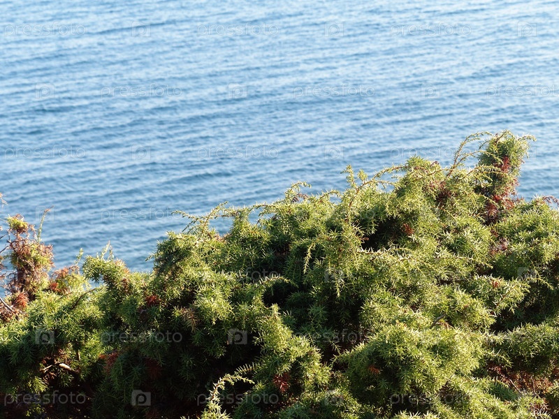 Вечнозеленые деревья на фоне спокойного моря, полный штиль. Вид на море из парка. Прогулка в летнюю жару в тенистом парке. Южный берег Крыма