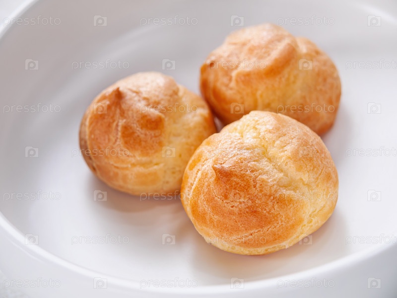 Пирожные профитроли лежат на белой тарелке. Крупный план. Выборочный фокус. Горизонтальный. Высокий ключ. белый фон