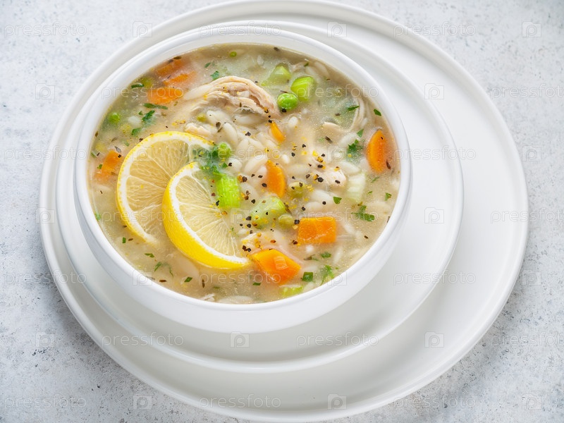 Итальянский куриный суп орзо с лимоном в белой миске на светлом фоне. Итальянская кухня. Домашний. Крупный план. Горизонтальный