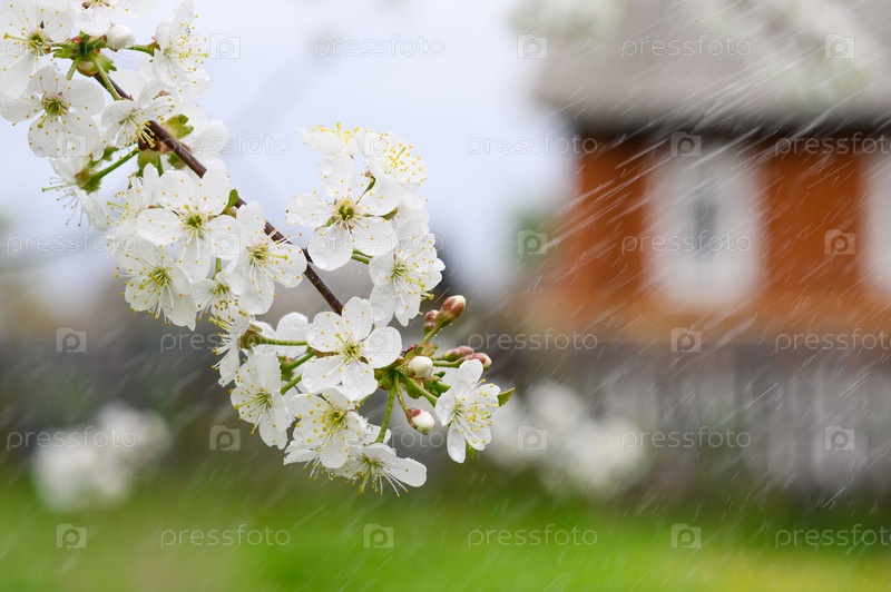 Цветущая ветка вишни под каплями дождя